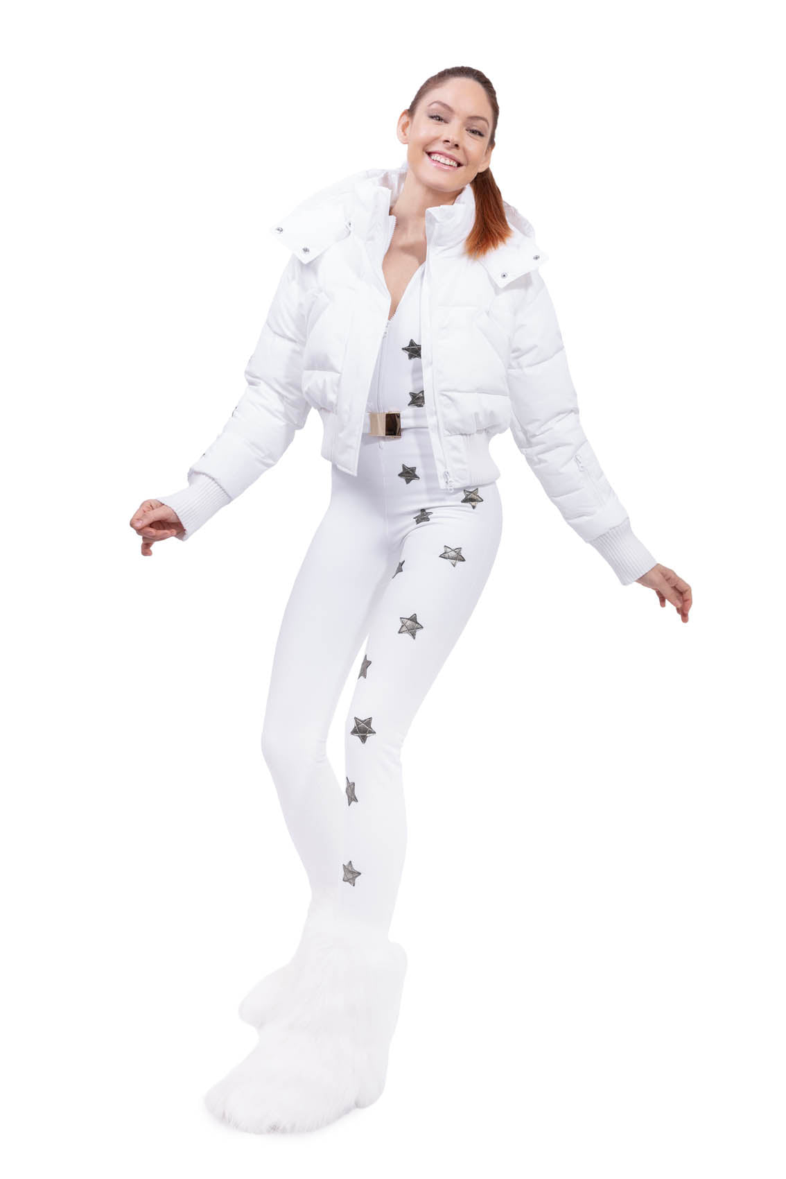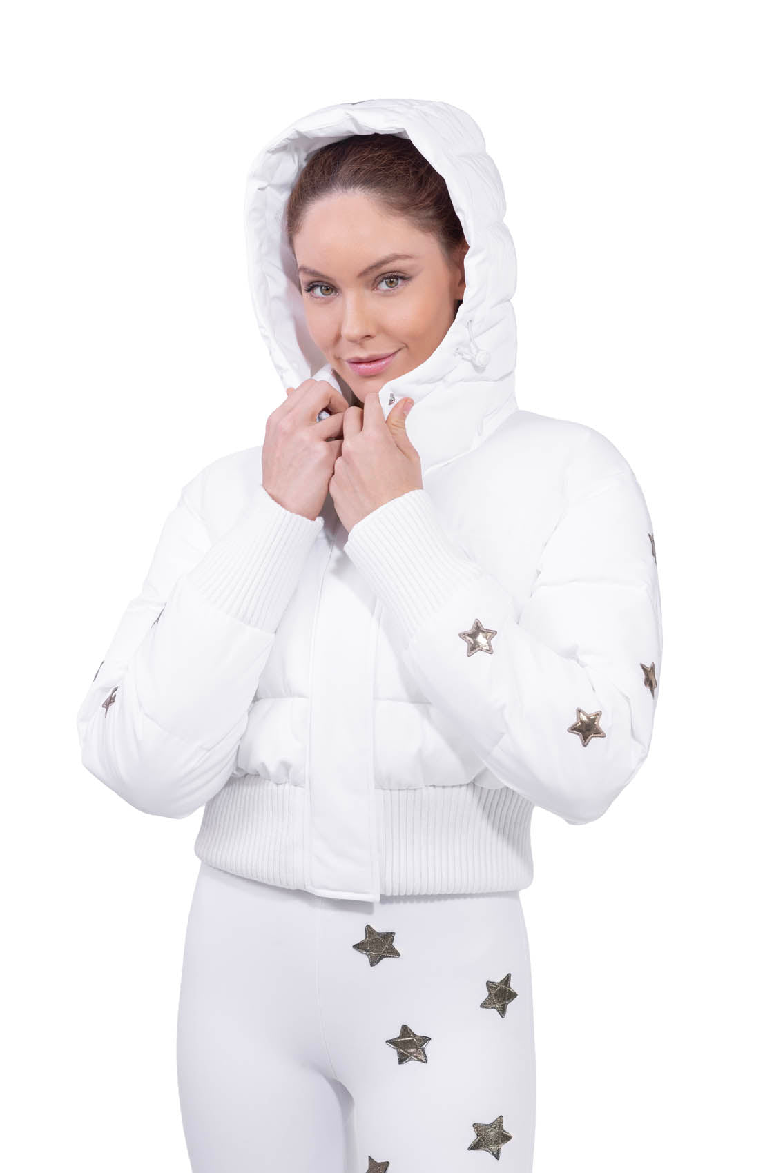 Eine kurze und umhüllende Daunenjacke, die auf der Piste und in Ihren Momenten in den Bergen glänzt. Die in Italien aus einem feinen wasserabweisenden technischen Stoff hergestellte Neve Down Jacket vereint Wärme, Weiblichkeit und modische Ästhetik mit dem unvermeidlichen ikonischen Touch handapplizierter Sterne.