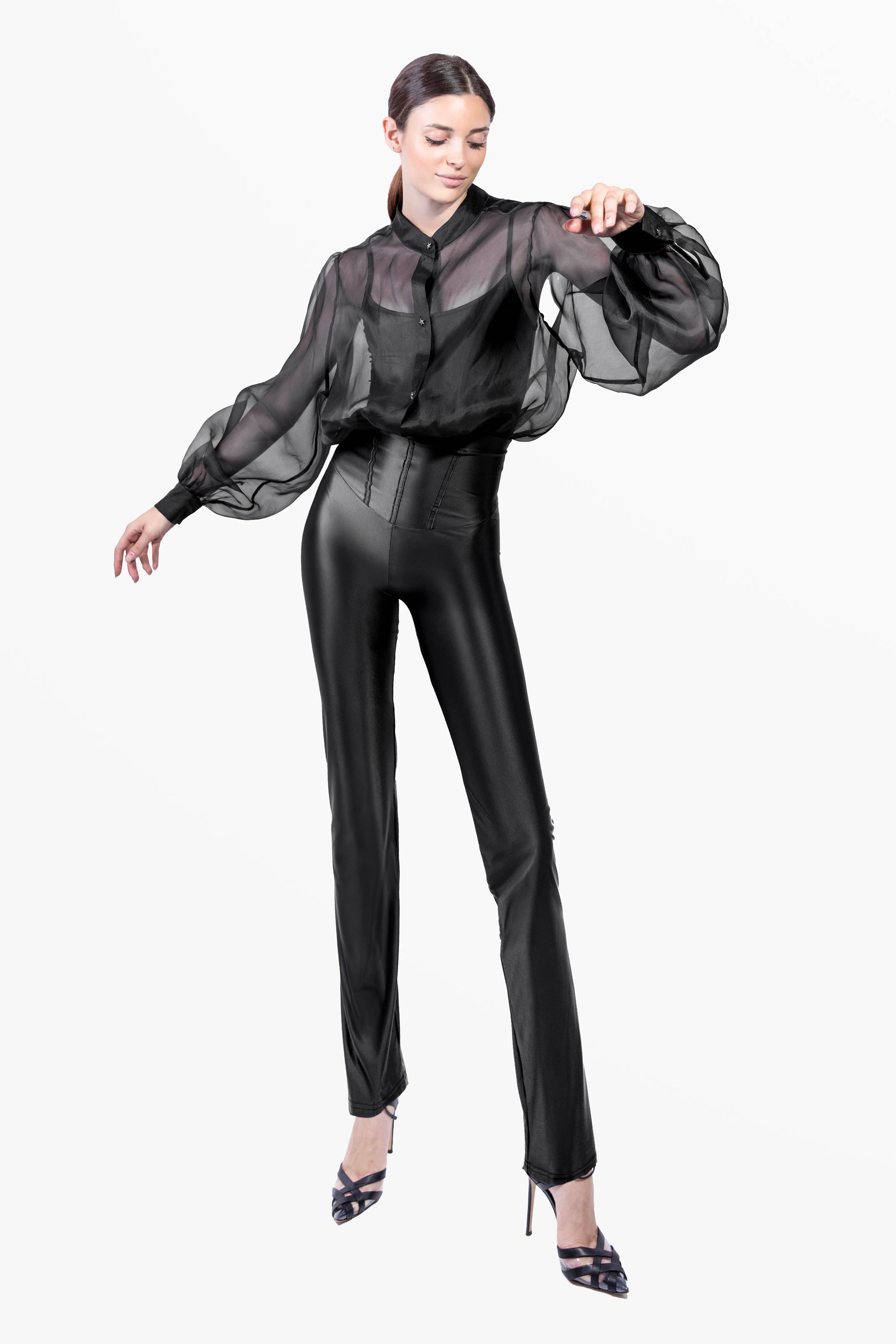 Leichtigkeit und Geheimnis vereinen sich in Odile – der neuen Hose aus strukturiertem, seidigem Lycra.