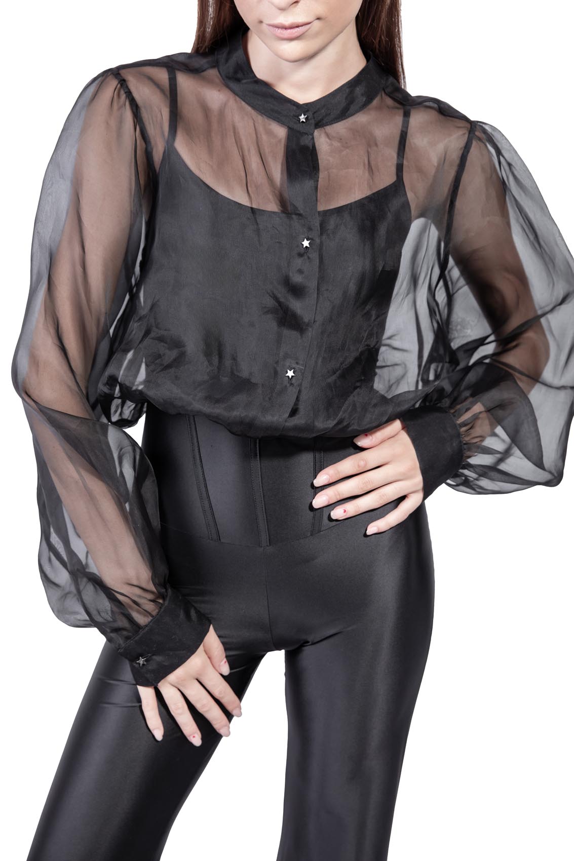 The sheer silk organza shirt is seamlessly integrated with a built-in bodysuit, creating a dynamic contrast between structure and lightness.