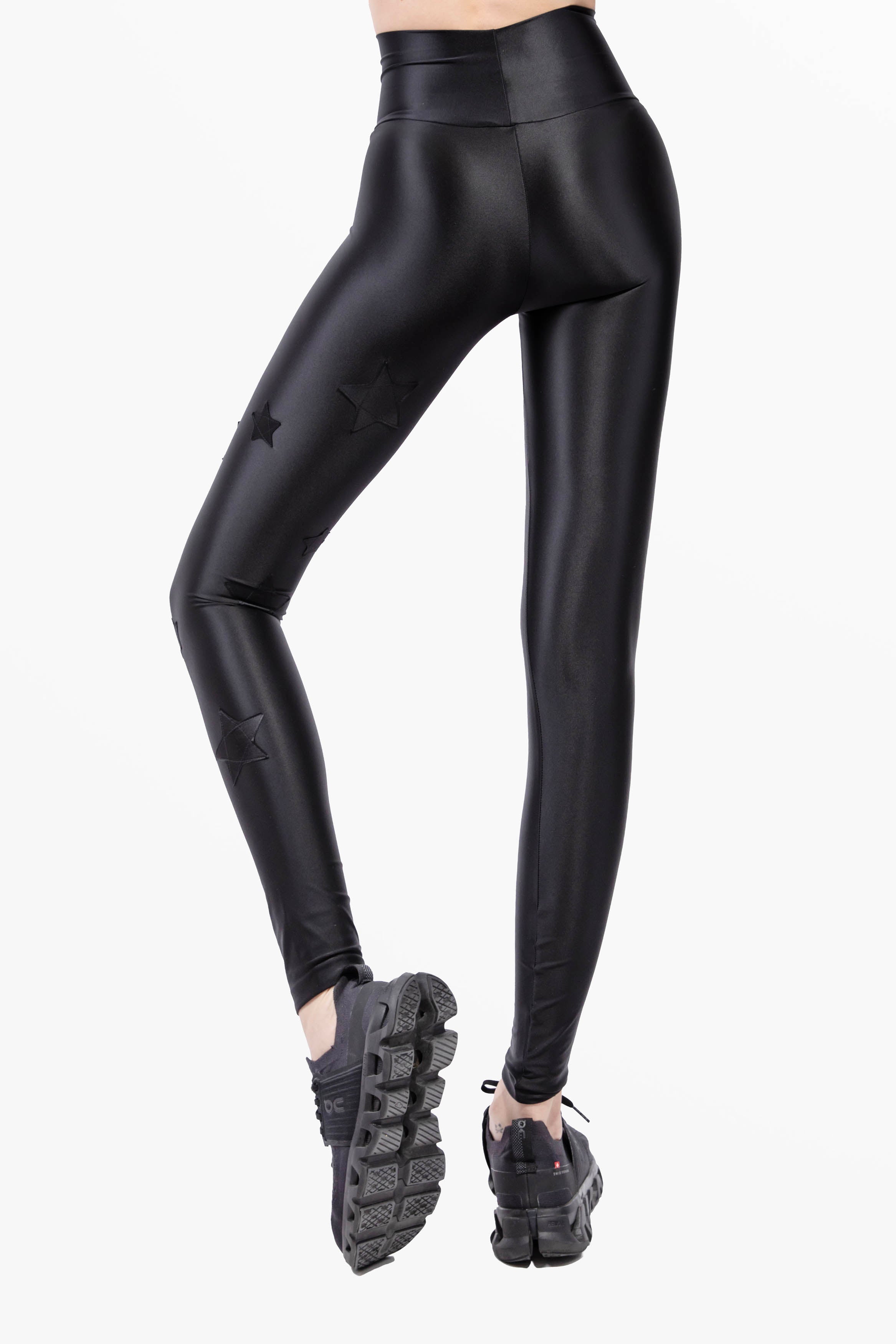 Précieux leggings en lycra soie, ceinture à la taille, étoiles appliquées en lycra et tissu lurex couleur argent.